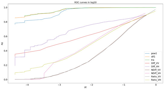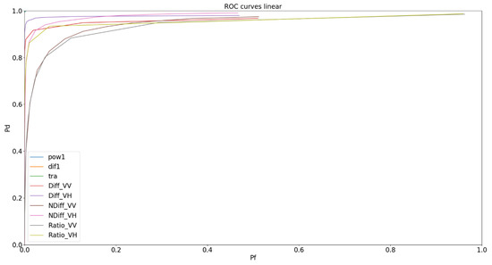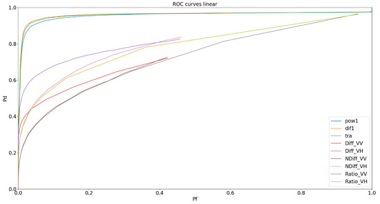 To benchmark the processing, traditional detectors were used: Difference, Normalised Difference and Ratio Detectors in VV and VH polarisation channels. Additionally, we used newer detectors, Power Difference, Power Ratio [49,50,51] and the Hotelling–Lowley Trace [52,53] detectors. Once these were implemented, Receiver Operating Characteristic (ROC) curves were displayed to evaluate the performance of each detector. A ROC curve is a graphical technique that plots sensitivity (true detection) against specificity (false alarms) and allows for a visual assessment of a test ability to discriminate between the two [54].