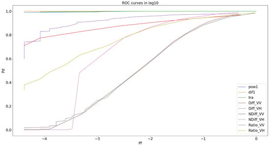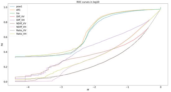 ROC curve in Log10 showing change detectors used on 19 October 2019 paddy & 24 April 2020 data: Difference VV and VH (Diff_), Ratio VV and VH (Ratio_), Normalised Difference (NDiff_), Power Difference (Dif1), Power Ratio (Pow1) and Trace (HLT).