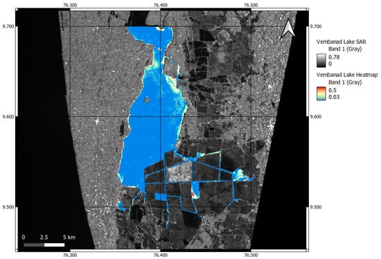 Sentinel-1 GRD images were processed (Figure 2) to determine if water hyacinth could be seen in SAR images of the Vembanad Lake. As shown in Figure 3 and Figure 4 (described in the next section) we can clearly observe areas where the backscattering of the lake is significantly higher.