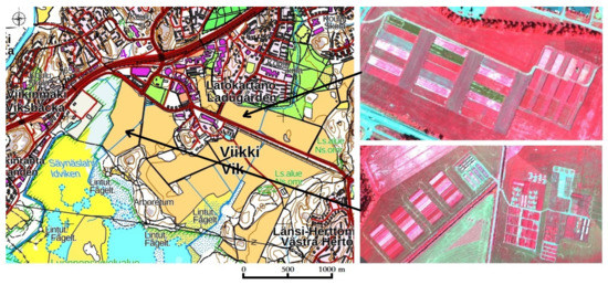 We used the crop data from a test field (Figure 1) belonging to the University of Helsinki, Finland (60°13′26″ N, 25°1′16″ E). The area of the test field is approximately 4 × 4 km. The mean elevation of this area is approximately 10 m above sea level. The mean temperatures are 18 °C and 6 °C in July and throughout the year, respectively. Six crop species with a total of 162 plots were included in the used dataset, including narrow-leafed lupin (Lupinus angustifolius L. ‘HaagsBlaue’), faba bean (Vicia faba L. ‘Kontu’), wheat (Triticum aestivum L. emend Thell. ‘Amaretto’), turnip rape (Brassica rapa L. ssp. oleifera (DC.) Metzg. ‘Apollo’), barley (Hordeum vulgare L. ‘Streif’, ‘Chill’ and ‘Fairytale’) and oat (Avenasativa L. ‘Ivory’ and ‘Mirella’). These crops are representative species grown in cool-temperate regions. The sizes of the plots in the different agricultural experiments varied between 10 × 2 and 50 × 12 m2. Six species were planted with different densities varying between 55 and 700 m−2 and the fertilizer levels varied between 0 and 150 kg N m−2, which resulted in the variation in the leaf area index.The plots are described in detail in a previous study [26].