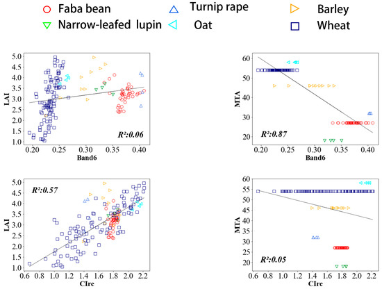 Figure 3. Correlations between simulated Sentinel-2 band 6 (740 nm) and the vegetation index CIRE with MTA and LAI in field-measured data.