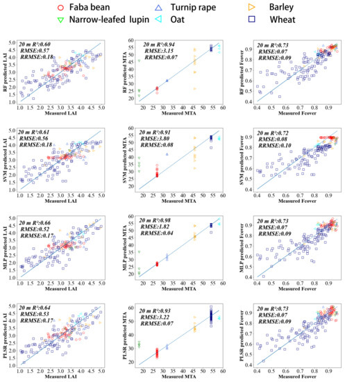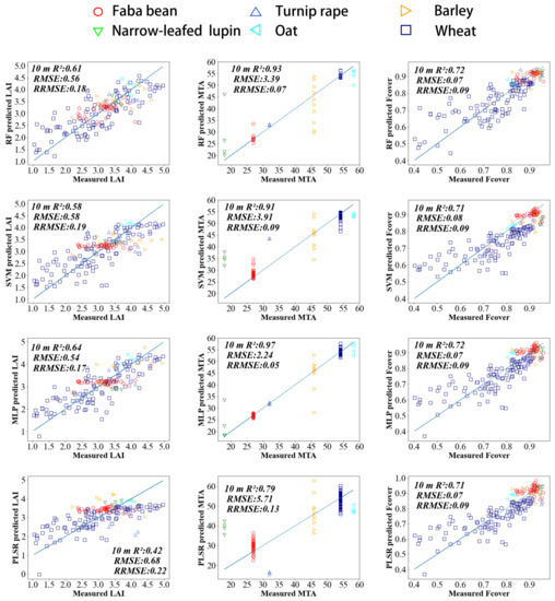 Individual band combinations were used as inputs to the algorithms for predicting canopy structure parameters based on their spatial resolution (10 and 20 m or better). Using only the bands which have 10 m resolution (Figure S2 and Figure 4), RF, SVM and MLP presented similar performance for LAI estimation in both model simulation and field-measured data. RF provided the best performance with R2 = 0.99 and RRMSE = 0.04 in PROSAIL simulation. In field-measured data, RF presented second best performance with R2 = 0.61 and RRMSE = 0.18, which was slightly worse than MLP. PLSR produced the weakest results in both model simulation and field-measured data. In MTA predictions, RF, SVM and MLP performed similarly in both model simulation and field-measured data. RF had the best performance with R2 = 1.00 and RMSE = 1.1° in model simulation. In field-measured data, RF presented the second best performance, which was slightly worse than MLP. PLSR performed the weakest. Statistics of all the estimated MTA data using 10 m resolution bands in AISA data are presented in Table S1. All the algorithms had similar performance for Fcover prediction, in both model simulation and field-measured data. RF had the best performance with R2 = 1.00 and RRMSE = 0.01 in model simulation and with R2 = 0.72 and RRMSE = 0.09 in field-measured data.