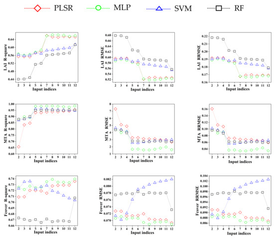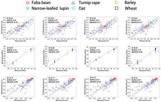 Generally, using bands which have different spatial resolutions (10 m and 20 m better) as inputs for RF, SVM and MLP algorithms yielded similar prediction accuracies in both model simulation and field-measured data. A similar finding was reported in previous studies performed by Verrelst et al. [71] using the Gaussian processes regression (GPR) algorithm and simulated S2 bands. Generally, RF had the best performance for estimating the three canopy structural parameters in PROSAIL simulations, but MLP performed best in field-measured data. The performance of ML algorithms is dependent on the amount and distribution of samples, RF is more suitable for the whole growth period, and the neural network method is more appropriate for a specific growth period of field crops [72]. In this study, the accuracies of LAI estimation in AISA data (R2 = 0.58–0.66) agreed with previous studies performed by Kganyago et al. [72] using sparse partial least squares, RF and gradient-boosting machine algorithms and S2 data (R2 = 0.49–0.76) but were lower than those reported in [71] (R2 = 0.91 – 0.92). However, the RRMSE values reported in [71] were 0.23–0.24, which were higher than those in our study (RRMSE = 0.17–0.18). Similar to LAI, the Fover estimation accuracy (R2 = 0.71–0.73) in field-measured data was lower than the value in [71] (R2 = 0.95), but the RRMSE values (0.09–0.10) were lower than that (RRMSE = 0.17) reported in [71]. In both model-simulated and field measured data, MTA could be accurately predicted (RMSE < 4° and RRMSE < 0.1) except for PLSR using only four bands which have 10 m resolution, which explored the potential of ML algorithms to estimate MTA of field crops from satellite remote sensing with satisfactory accuracy. The R2 values in Table 5 are generally larger than those in Table 4, indicating that vegetation indices indeed react to changes in vegetation structure. Nevertheless, vegetation indices used as ML model input features did not significantly improve canopy structure estimation.