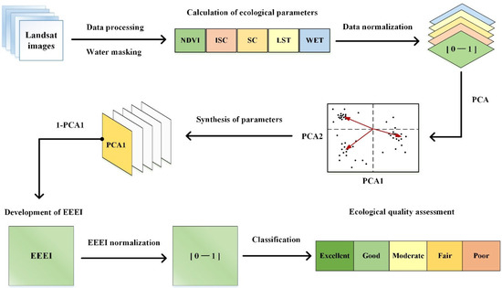 Firstly, PCA was used to integrate the five ecological parameters, and then the first component of PCA (PCA1) image was utilized to create the EEEI image, which contains the most information of all parameters. Finally, to make the larger values represent better ecological quality, the values of the PCA1 image were subtracted by 1.