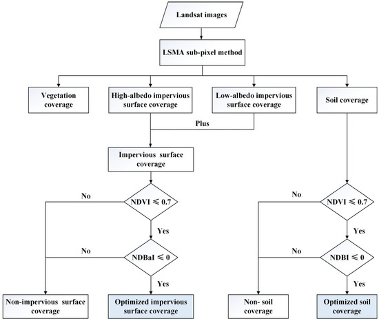 The ISC and the SC were calculated by linear spectral mixture analysis (LSMA) under a four-end-member model (vegetation, high-albedo impervious surface, low-albedo impervious surface, and soil) in this study [50].