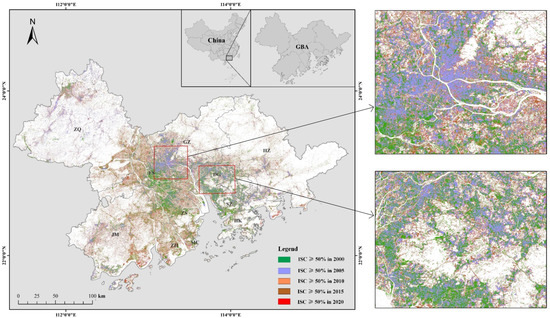 The GBA is one of the major bay areas in the world. Given its location with a long coastline and the policy of “reform and open-up,” the area has gradually become the forefront of rapid development and urbanization in China. With the increasing urbanization rates, the impervious surfaces of the GBA are continuously expanding (Figure 3). Thus, the ecological conditions of the GBA have been affected by economic construction and anthropogenic activities. Therefore, it is urgent to conduct ecological evaluations to understand the ecological environment and its spatiotemporal evolution in the GBA.