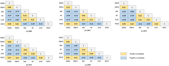 The five ecological parameters were integrated by PCA, and the PCA1-band image was selected to develop the EEEI image of the GBA from 2000 to 2020. As shown in Table 4, the eigen percentages of PCA1 are higher than 78% for the study years, which indicates that it represents the primary information and characteristics of the dataset. Therefore, the EEEI created by PCA1 can effectively contain most of the information of the five parameters. Moreover, the correlation among the EEEI and the five parameters were shown in Figure 4. The NDVI and the WET both have a positive effect on ecological quality and the three others (ISC, SC, and LST) have a negative effect. This illustrates that the results of the ecological quality evaluation expressed by the EEEI are consistent with the ecological meaning expressed by each of the five parameters. Therefore, the EEEI can appropriately synthesize the five ecological parameters to evaluate the ecological quality comprehensively and quantitatively. Furthermore, the correlation coefficients between the EEEI and the ISC are greater than 90% from 2005 to 2020, which indicates that the impervious surfaces (human activities) have a great impact on ecological quality, and the EEEI also effectively represents the anthropogenic effects on ecological quality in our study. In summary, the EEEI integrated with five ecological parameters can be used as an applicable and effective ecological index for ecological quality assessment.
