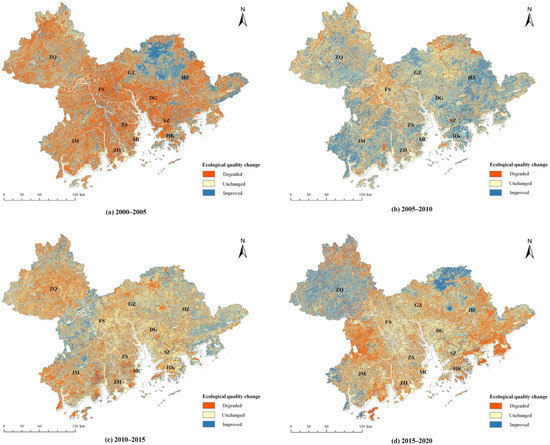 To analyze the temporal and spatial changes of ecological quality of the GBA from 2000 to 2020, the detected changes between two adjacent years was analyzed on the basis of EEEI classifications (level 1 to level 5). Therefore, the detected changes in the EEEI were further divided into three levels with nine values ranging from −4 to 4: (1) all positive values indicated that the level of the EEEI improved, classified as “improved”; (2) 0 values indicated that the level of the EEEI remained unchanged, classified as “unchanged”; and (3) all negative values indicated that the level of the EEEI degraded, classified as “degraded”.