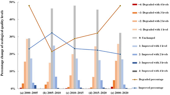Percentage changes of ecological quality levels of the GBA from 2000 to 2020.