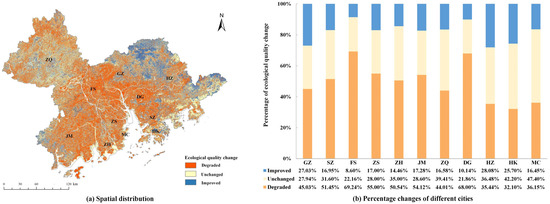 Furthermore, the detection of changes in ecological quality change of the GBA from 2000 to 2020 was also analyzed in this study. It shows that, overall, the ecological quality of the GBA significantly degraded from 2000 to 2020, and the percentage of the degraded areas reached 47.90% in total (Figure 7e). As shown in Figure 8, the area and percentage with the degraded value accounted for the highest proportions in all cities of the GBA, followed by the unchanged and the improved values.