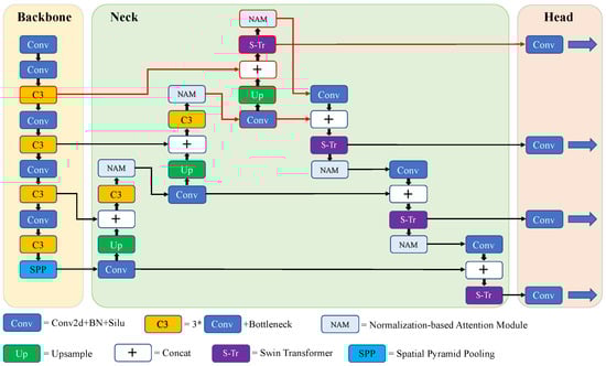 The architecture of SPH-YOLOv5. The red lines and boxes represent the added residual connections and feature fusion layers, respectively, compared to the original version. We also added five NAM modules and four Swin transformer encoders to improve performance.