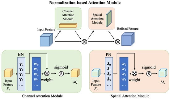 The NAM is the variant of the CBAM module [44,46], which was originally proposed for image classification. As shown in Figure 2, it includes redesigning channel and spatial attention submodules in sequence. They can reweight attention by adjusting the variance measurement of the training weights in both channel and spatial dimensions. One of the vital scaling factors comes from batch normalization (BN).