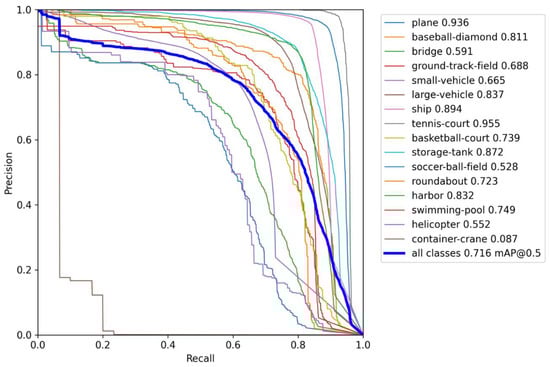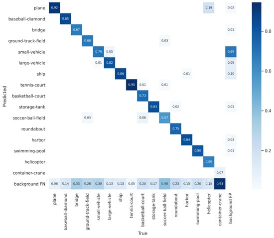 We first drew the P-R curve for each category as shown in Figure 4. The AP, the integrated area under the curve, is calculated in legend. The larger the AP, the better the detection performance. Generally, the Intersection over Union (IoU) threshold and confidence threshold are two essential metrics for deep learning models. We then calculated the confusion matrix of the SPH-YOLOv5 results for the DOTA test set with the IoU threshold 0.5 and the confidence threshold 0.25, respectively. As shown in Figure 5, the confusion matrix visualizes the classification of each category. Each row represents the predicted categories, each column represents the actual categories, and the data on the diagonal line represents the proportion of categories that were correctly classified. However, it is shown that the high FN for the container crane category means that most objects are missed. The corresponding AP is also very low. It is mainly because the container-crane category training samples are much less than other categories. The lack of training samples leads to a limited extraction of features and results in a high FN. In addition, the FP is high for the small vehicle category, producing false alarms. Although the training samples of small vehicle are sufficient, they belong to tiny objects, which are very hard to detect in a dense environment with objects blocking each other.