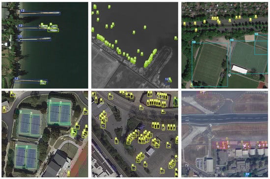 The DOTA dataset is derived from Google Earth, the Gaofen-2 (GF-2) satellite, the Jilin-1 (JL-1) satellite, etc. It contains 2806 RGB images ranging in size from 800 × 800 to 4000 × 4000. It contains 16 types of objects (plane, ship, storage tank, baseball diamond, tennis court, basketball court, ground track field, harbor, bridge, large vehicle, small vehicle, helicopter, roundabout, soccer ball field, swimming pool, and container crane).
