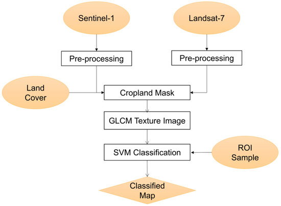 As mentioned earlier, to reduce computational time, the land cover data were adopted to provide a general distribution map of arable land in Egypt. Based on this map, texture features were first calculated and extracted from the Sentinel-1 or Landsat 7 data using the gray-level co-occurrence matrix (GLCM), similar to that described in [42,43] where Landsat and Sentinel-1 satellite data were used to classify crops in a small-scale farm in Zimbabwe and the overall classification accuracy higher than 80% was achieved using the GLCM texture features. Then, arable land was further classified into two kinds of regions used to grow grain and cash crops, respectively, by using support vector machine (SVM). Note that we only need to extract arable land used to grow grain to further predict grain yield. Although the crop classification accuracy achieved with SVM is worse than other methods such as the convolution neural network (CNN), SVM was selected in this study. The reasons are two-fold. Firstly, the crop classification accuracy achieved with SVM can up to 0.8375 [44], which can meet the requirements of this study. Secondly, only about 800 samples were obtained in this study. This means that the number of samples is very small at the national level. If CNN is adopted in this case, not only will overfitting occur, but also the space and time complexities will be much larger compared with the case of SVM. A flowchart of crop classification based on the GLCM texture feature is shown in Figure 2, and each step is described below.