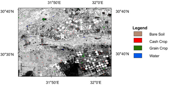 Regarding grain crop in Egypt, wheat is planted in November and harvested in May, and maize and rice are planted generally in June and harvested in September [46]. In contrast, regarding cash crops in Egypt, cotton is planted in March and harvested in September. According to the unique phenology of each crop, corresponding samples were selected for grain and cash crops. In order to improve the training accuracy, samples are polygons that contain multiple pixels; the principle of sample establishment is to evenly distribute samples as far as possible on the premise that the ground object category can be accurately judged. Each polygon contains only one ground object, and the number of pixels is between 25 and 100. This ensures that a variety of pixels with small differences are covered in samples of the same category. In practical operation, more than 800 samples were first labeled in historical imagery acquired over Egypt in 2010, 2015, and 2020. Note that, historical imageries were provided by Google Earth Pro Desktop, and the selected samples contain the polygon of various ground features such as bare soil, water, cash, and grain crops. According to the principle of sample establishment, the number of polygon samples of different categories is related to the total area of classes. Then, one-half of the sample polygons were taken for training and the other half of the feature polygons were used for testing. Division according to polygons rather than pixels is to avoid over-fitting. Figure 3 shows some samples selected from the Google Earth images, overlapped on the GLCM-based texture feature map according to their geographic coordinates. Here, the GLCM-based texture feature map was derived from Sentinel-1 data.