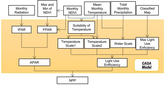 NPP is defined as the overall amount of organic matter accumulated by plants in the primary production stage per unit time and unit area. It is determined by factors such as solar energy, temperature, and precipitation, and is positively influenced by living organisms such as microbial biomass. CASA is a classical parameter model and estimates NPP by focusing on the driving role of the absorbed photosynthetically active radiation (APAR) and the light use efficiency absorbed by vegetation [53]. Different from other prediction models that require fine biochemical parameters, the CASA model only needs to input land cover type, monthly NDVI value, monthly cumulative precipitation, monthly average temperature, and solar radiation’s monthly cumulative value. The parameters that need to be manually input are also introduced in [54], which are more suitable for estimating NPP in a wider range. A flowchart of estimating NPP using the CASA model is shown in Figure 4.
