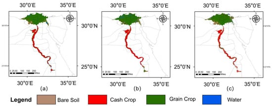 According to the unique crop phenology for each crop described in Section 3.1.2, crops in Egypt can be classified into cash and grain crops based on the GLCM mean texture features, which were extracted from the Sentinel-1 or Landsat 7 data acquired in different months.