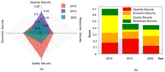 Food security evaluation results in 2010, 2015, and 2020. (a) The radar chart shows the variation in the four dimensions in different years, and (b) the histogram shows the weight of the different dimensions in 2010, 2015, and 2020.