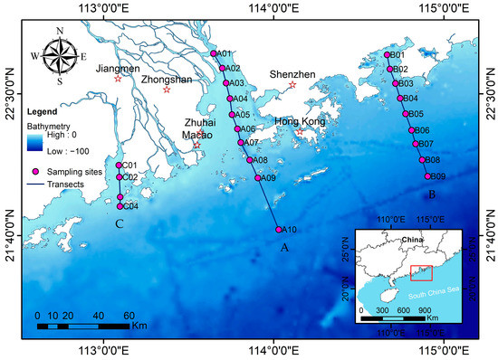 Optical and ecological environmental measurements were conducted in January 2020. The locations of the stations are shown in Figure 1. The stations were divided into three transects (A, B, and C). Transects A and C were located in the Lingdingyang Estuary and Huangmao Sea Estuary, respectively; both of them were estuaries of Pearl River, which is the largest water system in South China, with an annual mean runoff volume of 326 billion m3 [26]. Measurements were conducted at 10 stations and 4 stations, respectively, for transects A and C. Transect B was located in Daya Bay, and measurements were conducted at 9 stations. Facing the vast SCS, the research area has a subtropical and tropical monsoon climate, with an average temperature of 21–23 °C and a rainfall of more than 1500 mm each year [27]. The tide in the research area is irregular mixed semidiurnal tide, and the tidal range is up to 2 m. A total of 23 observations were conducted at all stations; for each station, a profiling optical measurement was conducted to obtain the water IOP (including coefficients of absorption, attenuation, scattering, and backscattering) and PSD data.