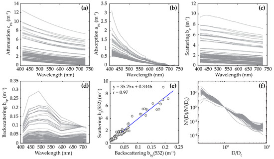 Similar to bbp, Equation (8) can be written for bp(λ) and cp in the same way. To describe the correlations between PSD and IOPs, the bbp, bp, and cp were all analyzed in this study.