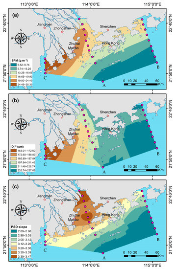 Figure 3 shows the spatial distribution of the Dv50 and PSD slope, which was generated by a kriging interpolation with 23 stations, coupled with the spatial distribution of SPM for comparison. The Dv50 showed a large spatial variability for the surface water of the research area, covering a range of 153.01 to 237.69 μm. Big differences occurred for the three transects, among which Transect B covered a Dv50 range larger than 211.46 μm, while Transect C covered a Dv50 range smaller than 172.6 μm, and Dv50 of Transect A almost fell in between them. The Dv50 in the eastern area showed relatively higher values than the western area; on the contrary, the SPM in the eastern area showed relatively lower values than the western area. The lower Dv50 values were consistent with the higher SPM values; both were located in the water areas adjacent to river estuaries. The PSD slopes in the research area also showed relatively larger variability, with a range of 2.89 to 3.47. Additionally, as we can see, lower PSD slopes were most likely to exist in waters away from land, while relatively higher PSD slopes were found in the nearshore waters. Similar to the SPM distribution, the lowest PSD slopes occurred in the waters of Transect B and away from land.