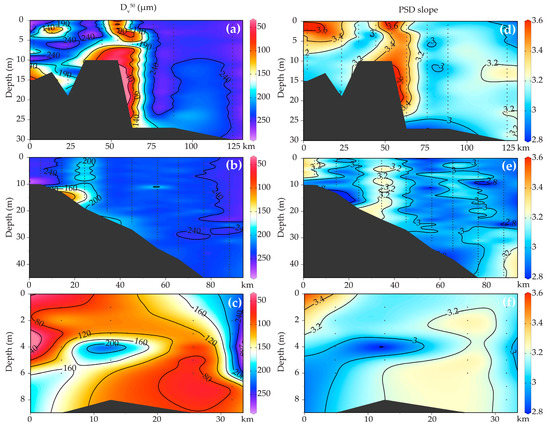 Left panel: vertical distribution of Dv50 for (a) Transect A, (b) Transect B, and (c) Transect C; right panel: vertical distribution of PSD slope for (d) Transect A, (e) Transect B, and (f) Transect C. The horizontal axis indicates the distance 5 km away from the first station of each transect, the black dots represent the sampling points, and the black shading indicates the bathymetry in each subfigure.