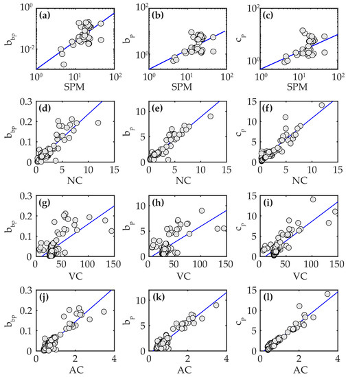 Correlations between the IOPs (i.e., bbp, bp, and cp) and the concentrations of suspended particles in mass, volume, number, and area (i.e., SPM, VC, NC, and AC). (a–c) SPM vs. bbp, bp, and cp; (d–f) NC vs. bbp, bp, and cp; (g–i) VC vs. bbp, bp, and cp; (j–l) AC vs. bbp, bp, and cp. The blue line is the best-fit line in each subplot.