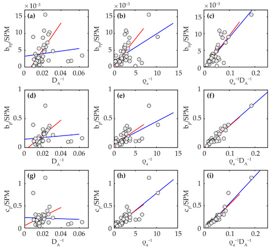 Correlations between the mass-specific backscattering (bbp/SPM), scattering (bp/SPM), and attenuation (cp/SPM) vs. the inverse of mean particle diameter (DA−1), mean apparent density (ρa−1), and the product of them (ρa−1DA−1). (a–c) bbp/SPM vs. DA−1, ρa−1, and ρa−1DA−1; (d–f) bp/SPM vs. DA−1, ρa−1, and ρa−1DA−1; (g–i) cp/SPM vs. DA−1, ρa−1, and ρa−1DA−1. The blue line is the best-fit line for all samples and the red line is the best-fit line for partial samples (x < 0.03 for (a,d,g); x < 5 for (b,e,h); x < 0.1 for (c,f,i)) in each subplot.