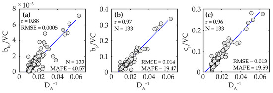 Correlations between the volume-specific IOPs and the inverse of mean particle size (DA−1). (a) bbp/VC vs. DA−1; (b) bp/VC vs. DA−1; (c) cp/VC vs. DA−1. The blue line is the best-fit line in each subplot.