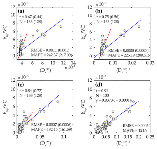 Correlations between the volume-specific backscattering bbp/VC vs. (a) the inverse of the 90th percentile diameter (Dv90)−1; (b) the 50th percentile diameter (Dv50)−1; (c) the 25th percentile diameter (Dv25)−1; (d) the 10th percentile diameter (Dv10)−1. The blue line is the linear fit for all data displayed in each subplot. The red line is the linear fit for partial data ((Dv90)−1 < 0.005, (Dv50)−1 < 0.01, and (Dv25)−1 < 0.05), and the accuracies are shown between brackets.