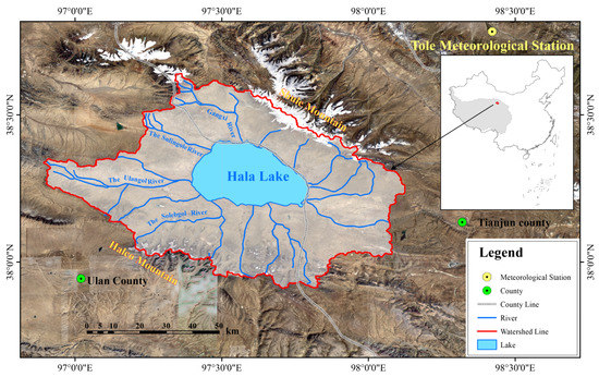 Hala Lake Basin is located in the Qilian Mountains in the north of the TP, with the Basin area of (Figure 1). Hala Lake is a closed saline lake with an altitude of about . The average depth and maximum depth of Hala Lake is and , respectively. The water storage is about . There are more than 40 short rivers with small flows and 118 glaciers that feed into Hala Lake. The climate in the Hala Lake Basin is dry and cold.