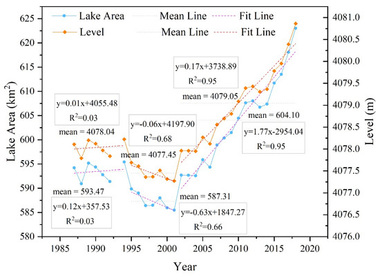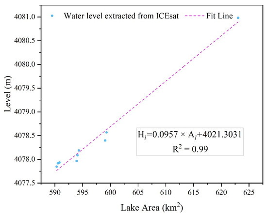 The water levels, which cannot be extracted from ICESat data, can be estimated by LRC (Figure 2) according to corresponding water areas. The following formula was used to estimate the change of water storage of Hala Lake between different years and :