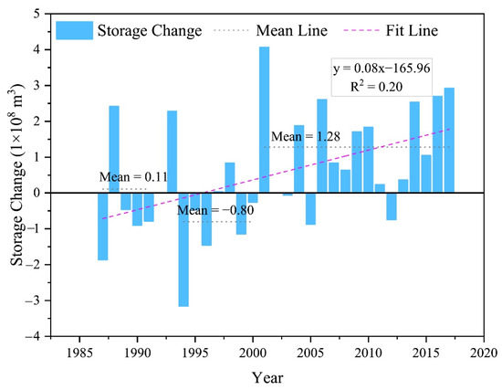 The average annual change of water storage of Hala Lake was during 1987–1994 (Figure 5). The storage of Hala Lake decreased from 1995 to 2001 and increased by , with an average annual increase rate of about , from 2002 to 2018 (Figure 5).