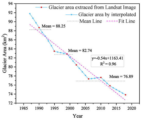 Landsat images obtained in 1990, 1995, 1999, 2002, 2006, 2010, 2013 and 2018 meet the requirements above and can be used to extract glaciers in the Hala Lake Basin. The glacier area of other years during the study period were obtained by interpolation. There was no data about the glaciers during 1987–1990 in the Hala Lake Basin; the annual change in the glacial area from 1987 to 1990 was thought to be the same as during 1990–1995.