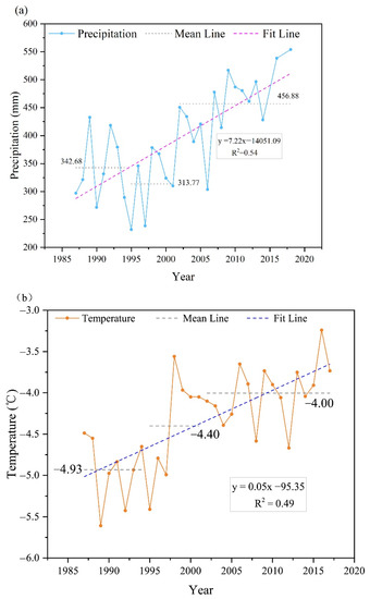 The temperature of Hala Lake Basin was on the rise during the research period. During 1987–1994, the average annual temperature was C. The average annual temperature of 1995–2001 was C higher than that from 1987 to 1994 (Figure 7b). The temperature change point in the Hala Lake Basin occurred in 2001 (Figure 8b). The average annual temperature reached C after 2001 (Figure 7b).