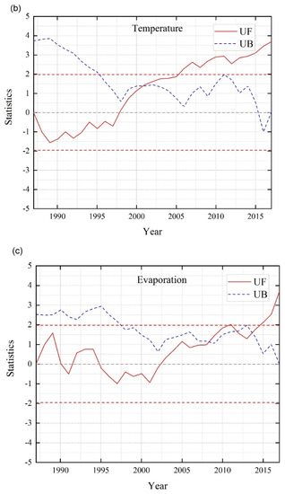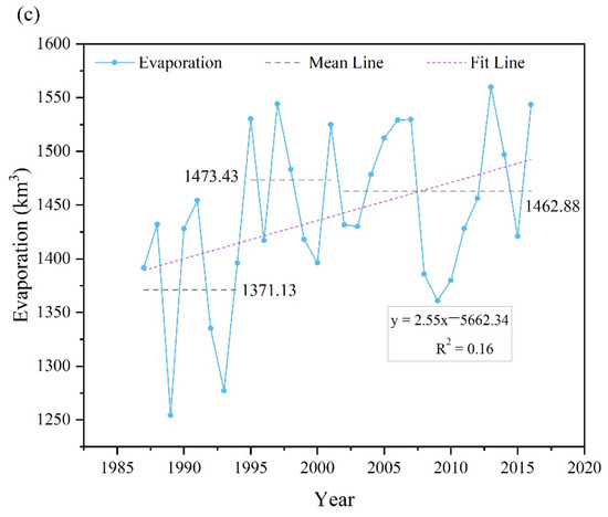 The evaporation in the Hala Lake Basin also increased with fluctuations. The annual average evaporation was 1371.5 mm during 1987–1994 and increased to 1473 mm from 1995 to 2001. During 2002–2018, the average annual evaporation was 1462 mm which was 90.5mm higher than the first stage but slightly lower than that from 1995 to 2001 (Figure 7c). The results of the Mann–Kendall test cannot indicate the change point of evaporation because the curves and intersect at three points (Figure 8c).