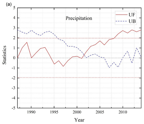 From 1987 to 2018, precipitation in the Hala Lake Basin increased with fluctuations. The average annual precipitation from 1987 to 1994 was about . From 1995 to 2001, which was the driest during the study period, the average annual precipitation decreased compared to 1987 to 1994 (Figure 7a). As illustrated in Figure 8a, the Mann–Kendall step change point test showed that the change point of annual precipitation in the Hala Lake Basin occurred in 2001. The annual average precipitation increased by compared with before 2001 (Figure 7a). The wetting trend is associated with simultaneously weakened westerlies over the TP [63].