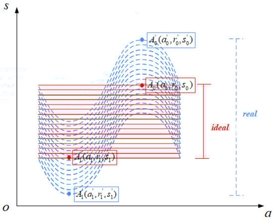 The blue solid line and red dashed line correspond to the non-ideal track and ideal track. When the baseline length changes from the projection of along the elevation direction to the projection of , the effective baseline length under the non-ideal track and ideal track equations are expressed as follows.