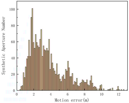 According to the above statistics, there are a total of 2087 strips that meet the requirements. The remaining strip data are the cases of large motion errors caused by non-ideal trajectories comprising bumps. The statistics of motion errors in the synthetic aperture are shown in Figure 7. The vertical coordinate is the number of compliant subapertures and the horizontal coordinate is the specific value of the motion error. Clearly, relatively large motion errors exist in the data. The above analysis proves that the actual data support the proposed method.