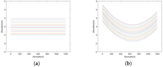 Single-point imaging requires an effective irradiation range within the synthetic aperture time. The actual effective baseline length variation projected into the azimuth–elevation geometric plane as shown in Figure 4. The figure clearly shows the antenna array element position with a bump on the platform.