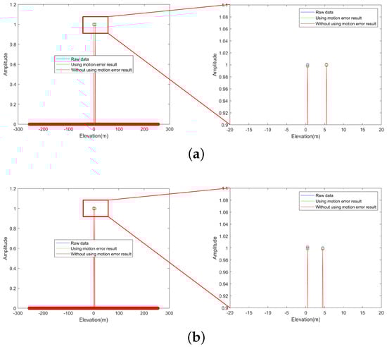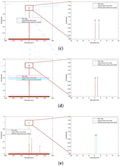 Figure 9a–d show effective results of distinguishing two targets by using and without using the motion error when the elevation intervals are 2–5 m. Nevertheless, the discrimination ability of spurious targets and outliers is improved by using the motion error. As Figure 9e shows, when the elevation interval is 1 m, the proposed method using the motion error can effectively distinguish two targets, while the method without using the motion error cannot completely distinguish the targets. Therefore, the proposed method shows great application potential in elevation resolution. The simulation results indicate that the conventional method without using the motion error can achieve a Rayleigh resolution 16 times higher than the theoretical Rayleigh resolution, while the proposed method can achieve 32 times the theoretical Rayleigh resolution.