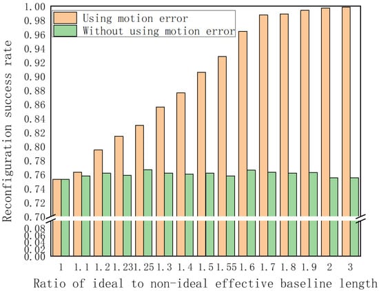 To evaluate relevant performance, we conducted 100 runs of Monte Carlo experiments with different motion errors, and the results are shown in Figure 10. The ideal linear motion range was fixed while gradually increasing the motion error. Fifteen groups of signals were used for the experiment. The set of effective baseline size ratios of the method using the motion error to the method without using the motion error was shown in Table 2. It can be seen that reconstruction success rate increases significantly with increasing ratio. When the ratio is times, there is already a high probability that the method using the motion error can distinguish targets with 1 m elevation interval. In conclusion, the proposed method can improve the elevation resolution substantially in practical situations.