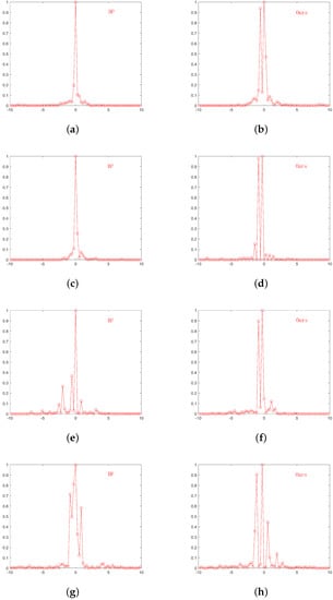 Comparison of reconstruction performance in layover points. (a) BP reconstruction result of point 1 and point 2. (b) Proposed method reconstruction result of point 1 and point 2. (c) BP reconstruction result of point 3 and point 4. (d) Proposed method reconstruction result of point 3 and point 4. (e) BP reconstruction result of point 5 and point 6. (f) Proposed method reconstruction result of point 5 and point 6. (g) BP reconstruction result of point 7 and point 8. (h) Proposed method reconstruction result of point 7 and point 8.