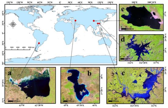 A total of five test lakes from around the world, which feature different climates, water types, and landscapes, were chosen to examine the robustness and general applicability of the TSIRB method. The five case lakes (Figure 1 and Table 1) include (a) Chiquita Lake, (b) Urmia Lake, (c) Dongting Lake, (d) Poyang Lake, and (e) Qinghai Lake. These lakes cover several typical lake types: freshwater lake, saline lake, river lagoon, and plateau lake (detailed in Table 1).
