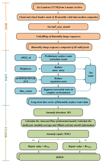 Long-term monitoring of lake water is an important part of global change research. However, obtaining long-term lake observation data with high temporal and spatial resolution still face challenges. In this study, we developed a novel surface water mapping method—TSIRB, to construct long-term and bimonthly surface water dataset (BSWD) at a 30-m scale.
