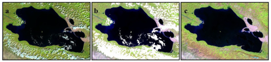 Illustration of the effect of the max-extent masking. (a) is the original image of Qinghai Lake in January 1990, in which the lake is frozen, and the light blue part is the snow-covered area; (b) is the preliminary extraction result; (c) is the result after max-extent masking.