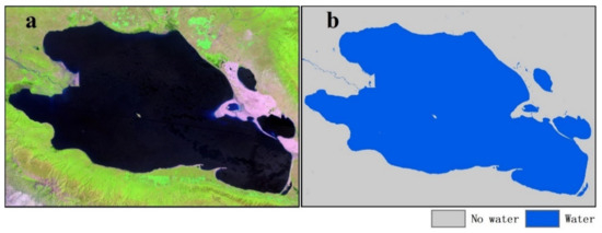 Illustration of water extraction for Qinghai Lake in July 2010. (a) is the original image; (b) is the preliminary result of extracting the water body using AWEIsh.