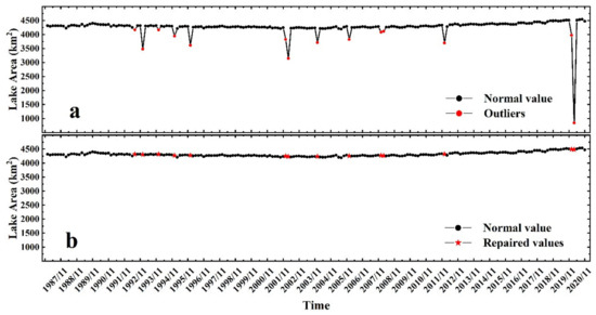The lake surface area sequence generally exhibits obvious periodicity, and there are always minimum and maximum values in a full cycle. For the restoration of the max area month, the IMA value often underestimates the area of the current month; while for the restoration of the minimum value month, the IMA value often overestimates the area of the current month. In order to improve the accuracy of sequence repair, different formulas are used for extreme months and non-extreme months in this research. For each lake, we first calculate the multi-year monthly average of the lake area series to obtain the extreme month information. Then, for the abnormal point in the extreme month (Em), the repair value is calculated according to the Formula (7). For the abnormal points in non-extreme months (NEm), Formula (8) is used to calculate the repair value. Figure 6b shows the results of outlier repair and sequence reconstruction of the Qinghai Lake area sequence.