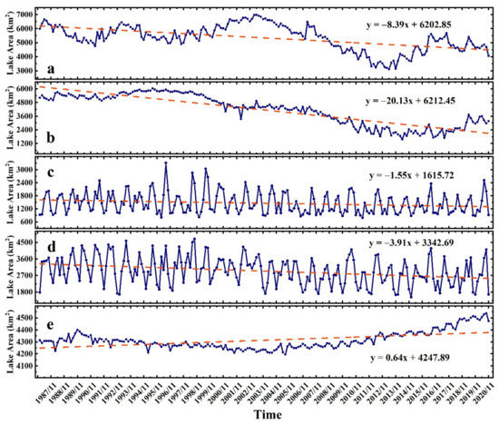 In order to further analyze the variation characteristics of the lake area time series, the commonly used linear regression model and the Mann–Kendall test were employed in this research. The trend of lake areas of five case lakes from 1987 to 2020 were determined by linear regression while the Mann–Kendall test was conducted to detect whether the slope for the regression line is significant.